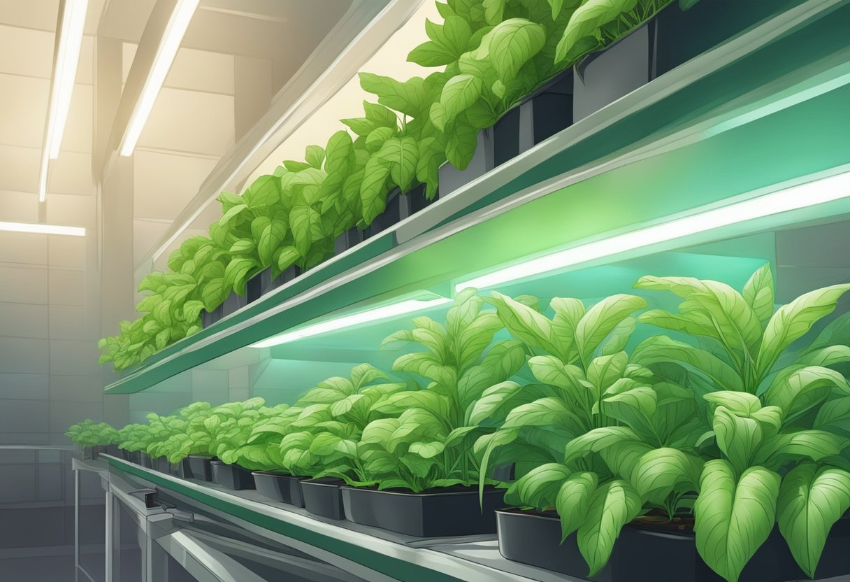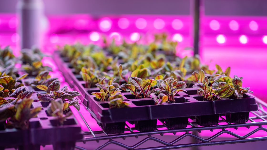 Lush green plants thrive in hydroponic gardens under artificial light